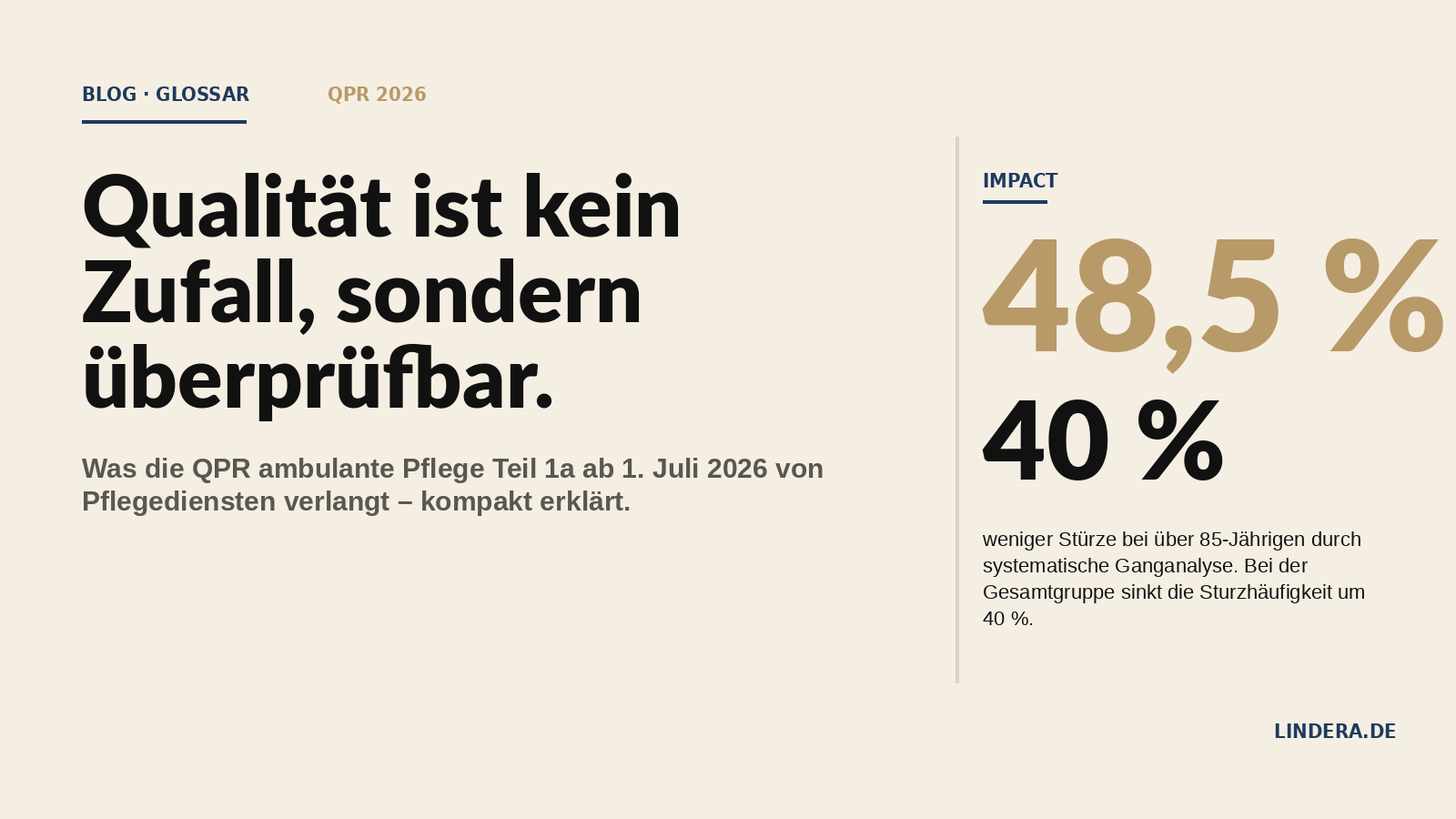 Auf einen Blick. Die Qualitätsprüfungs-Richtlinien ambulante Pflege Teil 1a (QPR Teil 1a) sind die bundesweit verbindliche Grundlage für die Qualitätsprüfung zugelassener ambulanter Pflegedienste nach §§ 114 ff. SGB XI. Erlassen vom Medizinischen Dienst Bund am 19. Mai 2025, genehmigt durch das Bundesministerium für Gesundheit am 7. August 2025. Inkrafttreten: 1. Juli 2026. Sie strukturieren die Prüfung in fünf Qualitätsbereiche und folgen einem beratungsorientierten Prüfansatz.